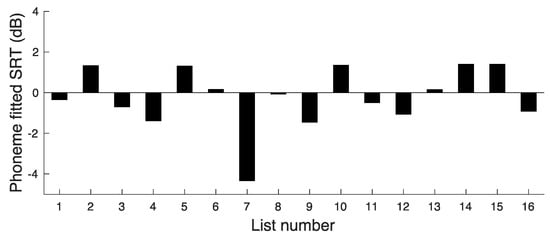 To get an initial estimate of the extent to which overall difficulty varied across lists, we calculated the mean percentage of phonemes correct separately for each list but averaged across the three SNRs. The mean score varied from about 87% to 94.5% correct across lists, with a mean of 91% and an SD of 2.2%. The same procedure as used for the word scores was adopted to assess the extent to which difficulty varied across lists when compared at similar SNRs. However, for the phoneme analyses, the values of SRT(x) were calculated as the SNR leading to 95 RAU (corresponding to 92% correct). This is close to the mean percentage score for the moderate SNR. The values of SRT(x) based on phoneme scores are plotted in Figure 2.