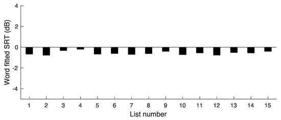 The resulting SRTs are shown in Figure 3. The mean SRT for the word scores was SRT(words) = −0.56 dB and the SD was 0.16 dB. This SD is much smaller than the SD of 1.3 dB for the first version of the COPT, indicating that the adjustments were successful in markedly reducing the variability in difficulty across lists.