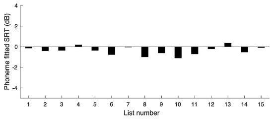 The same procedure as used for the word scores was adopted to assess the extent to which difficulty varied across lists. The SRTs based on phoneme scores are plotted in Figure 4. The value of SRT(Ave) was −0.38 dB. The deviations of the SRTs from SRT(Ave) give a measure of the variability in difficulty across lists. The SD of the SRTs was 0.39 dB. The SD was markedly smaller than for the phoneme-based SRTs of experiment 1, indicating that the adjustments made were successful in reducing the variability across lists. However, the SD was larger than for the SRTs for word scores, which was only 0.16 dB.