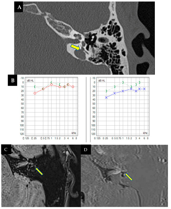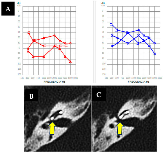 (A). Pure-tone audiometry showing normal hearing in the right ear (in red) and a moderate mixed-type hearing loss in the left ear (in blue), with a tympanogram classified as type B according to Jerger’s classification. (B,C). Computed tomography image of the left petrous bone in the sagittal plane (B) and axial plane (C). Cochleo-carotid dehiscence is observed (yellow arrow) with a lack of bony coverage between the apical region of the cochlea and the carotid canal.