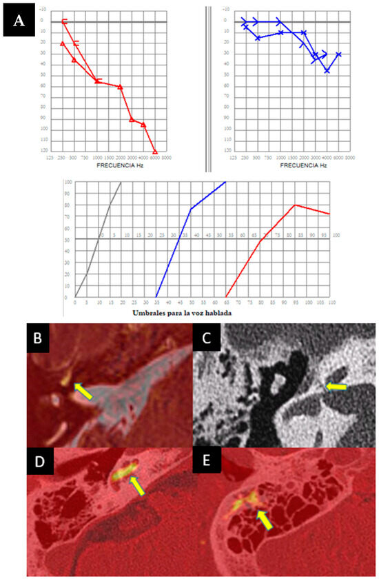 (A) Bilateral pure-tone audiometry showing mild hearing loss in the left ear (in blue) and moderate hearing loss in the right ear (in red), with speech audiometry indicating a retrocochlear pattern in the right ear. (B–E) MRI (Magnetic Resonance Imaging) in hydrops sequences showing marked hyperintensity of signal (arrow) in the perilymph in the right basal cochlear turn in the real inversion recovery sequence, which may indicate an inflammatory component. The extent of this signal hyperintensity necessitates ruling out a cochleofacial fistula component, which is confirmed (arrow) by performing an axial right petrous bone CT scan (C). (D,E) show axial fusion of cerebral MRI and CT showing potential inflammatory enhancement within the cochlea (arrow) and in the mastoid tip.