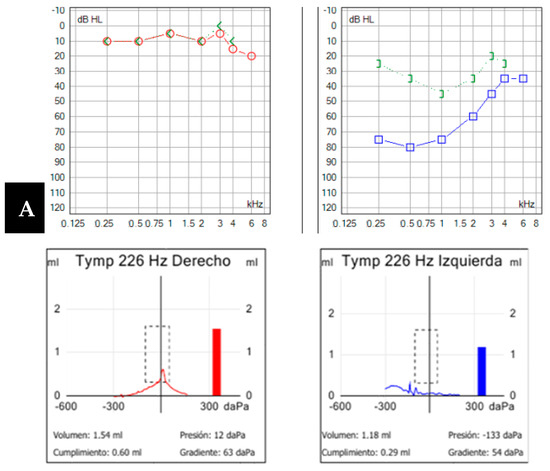 A 53-year-old man presented with bilateral hearing loss of two years duration, worsening in the right ear following a traumatic brain injury to the right temporoparietal region. He was a hearing aid user, reporting partial improvement, more pronounced in the left ear. He also experienced bilateral fullness and recurrent vertigo episodes lasting half a day daily, associated with Tumarkin’s otolithic crises and concurrent hearing fluctuations. The otoscopic and neuro-otological assessments were unremarkable. Audiological tests as free field audiometry revealed severe hearing loss in the right ear (up to 80 dB) and moderate loss in the left (55 dB) (Figure 2A), predominantly affecting low frequencies. Vestibular tests showed decreased oVEMPs and hypofunction in specific semicircular canals, with vHIT exhibiting slightly reduced VOR gain values for both HSC and PSC on the right side (0.67 and 0.55, respectively), with mainly covert saccades along with refixation saccades. Clinically diagnosed Ménière’s disease was confirmed, furthermore, through imaging findings with cerebral MRI and sequences of endolymphatic hydrops. Cochlear implant surgery in the right ear and intratympanic gentamicin in the left were indicated, despite contraindications for being bilateral (Webster et al. 2023 [11]). However, this patient experienced an average of up to two vertigo attacks per day, along with Tumarkin’s crisis falls and a history of refractoriness to rescue treatments, including vestibular sedation, oral corticosteroid treatment, and even intratympanic dexamethasone instillations. Therefore, treatment options were very limited.
