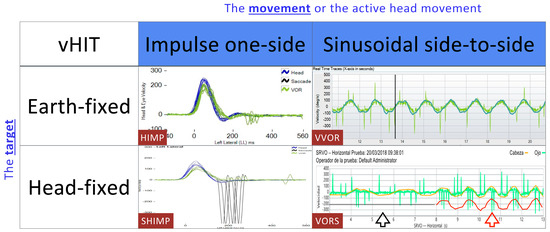 High-frequency suppression can be achieved using the SHIMP paradigm [12], while in low-frequency VORS the eye tends to remain static, and its velocity does not match the velocity of the head, potentially displaying a flat, motionless record. In Figure 1, we present the different vHIT paradigms in relation to the movement and the gaze fixation point.