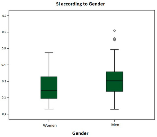 For this analysis, the bilateral SI was used, obtaining an SI value of 0.270 ± 0.092 for women and 0.319 ± 0.111 for men. Figure 3 shows the graphical differences between the SIs for men and women. Comparing both gains using the independent-samples Student’s t-test, a mean difference in the SI of 0.049 was found, which is statistically significant (p = 0.032). The SI is higher in men.