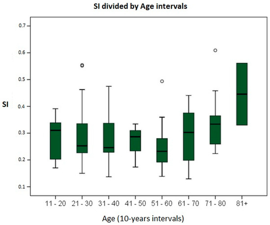 Figure 4 shows a trend of an increasing SI with advancing age. For this reason, the age categories were changed, grouping the subjects into two intervals: ≤60 years and >60 years. In our sample, there are 57 subjects aged 60 years or younger and 26 subjects older than 60 years. The mean SI in subjects aged 60 years or younger was 0.281 ± 0.095, and 0.324 ± 0.119 in subjects older than 60 years. To assess the existence of differences, the independent-samples Student’s t-test was performed, obtaining equality of variances and a mean difference of −0.042 ± 0.066 (p = 0.088), with a trend towards statistical significance.