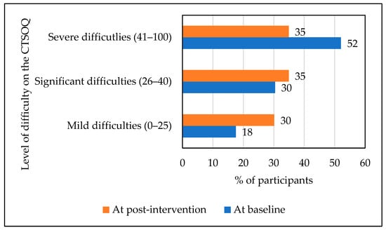 The distribution of scores is shown in Figure 1, indicating that 52% of SOs (n = 101) had severe difficulties at baseline when compared with 35% of SOs (n = 22) at post-intervention. Also, 30% of SOs (n = 19) had mild difficulties post-intervention when compared with 18% of SOs (n = 34) with mild difficulties at baseline.