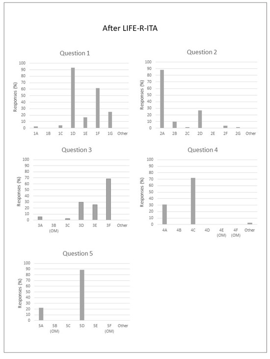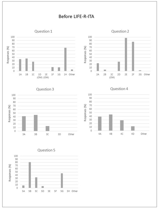 Figure 1 shows the results of the multiple-choice questions from before LIFE-R-ITA. Bar graphs represent the percentage of cases indicated by the students, who were allowed to select multiple answers for each question. Omitted answers are indicated by the letters “OM”. Students in the sample were similarly distributed across desks in the classroom (questions 1A, B, and C), and about 68% indicated that their position was close to where the teacher stood to talk to the class (question 1H).