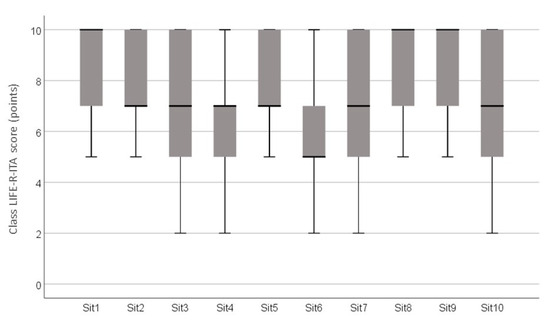 The score for the Student Appraisal of Listening Difficulty LIFE-R-ITA section was, on average, 72.26% (SD = 11.93%), for a total of 15 LIFE listening situations (Figure 2 and Figure 3). Most challenging situations were listening in a large room (Sit13, 5.7 ± 2.14), listening when other students make noise (Sit6, 6.06 ± 2.2), listening during a gym class (Sit12, 6.07 ± 1.72), and students answering during a discussion (Sit4, 6.5± 2.2). Social listening situations (LIFE social) were experienced by hearing students as more effortful than classroom listening situations (LIFE class): students reported 7.5 (SD = 1.28) vs. 6.7 (SD = 1.34), respectively, and the differences were statistically significant (Student’s t = 10.51, p < 0.001).