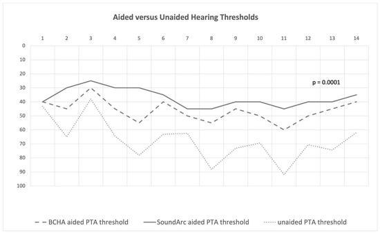 The mean BCHA-aided threshold was 46.4 ± 7.7 dB HL, and the mean SoundArc-aided threshold was 37.1 ± 6.4 dB HL, resulting in a significant functional gain for both the aided conditions versus the unaided condition (p = 0.0001) (Figure 1). Only two patients (#1 and #3) did not show a significant improvement; they were the only two patients with moderate conductive hearing loss and good BC thresholds (Table 1).