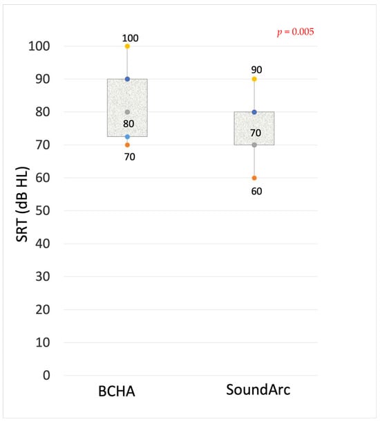 Speech tests in quiet and noise. Raw data for the single patients are reported in Table 2. Speech perception outcomes expressed as speech reception thresholds (SRTs) are reported in Figure 2. With SoundArc, patients achieved slightly better speech perception in quiet. The Wilcoxon test provided a statistically significant difference between the two groups; in particular, the SRT of 100% correct answers was at 80 and 70 dB HL, respectively (p = 0.005). As reported in Figure 3, more consistent differences between BCHAs and SoundArc were found in noise: the WRS in noise was improved with SoundArc in all the tested conditions: +19.3 at SNR +10 dB, p = 0.002; +12.1 at SNR 0 dB, p = 0.006; and +11.4 at SNR −10 dB, p = 0.002.