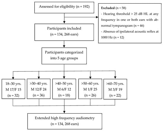 This cross-sectional study involved 134 participants aged between 18 and 70 years, with the sample size calculated and categorized into the following age groups: 18–30 years (32 subjects), >30–40 years (36 subjects), >40–50 years (18 subjects), >50–60 years (26 subjects), and >60–70 years (22 subjects) (Figure 1). This study was conducted at Srinagarind Hospital, Khon Kaen University. Data were collected during September 2023 to February 2024. The inclusion criteria were as follows: (1) Thai individuals aged 18–70; (2) absence of hearing and communication difficulties; (3) no subjective tinnitus; and (4) no history of middle ear problems or surgeries. The exclusion criteria were the following: (1) a history of chemotherapy or aminoglycoside use; (2) occupational noise exposure exceeding 1 year; (3) a family history of hearing loss; (4) presence of systemic diseases; (5) a history of stroke, or chronic kidney disease, or thalassemia with iron chelation; (6) diabetes duration exceeding 5 years []; (7) hypertension duration exceeding 3 years or uncontrolled blood pressure levels []; (8) smoking exceeding 15 packs/year [] or continuous smoking exceeding 5 years []; (9) alcohol consumption exceeding 400 mL/month; and (10) any abnormal use of drugs. Prior to participation, written informed consent was obtained from all participants after providing information about the hearing examinations and expected benefits.