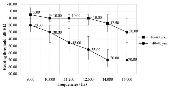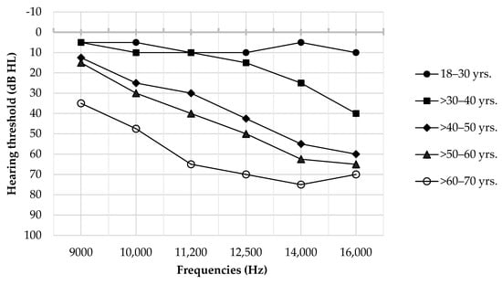 The current findings also conclude that hearing thresholds in the EHF range in Thailand increase with age, with significant age-related changes becoming evident after the age of 40. This implies that in the Thai population, the effects of aging on hearing begin at frequencies above 9000 Hz starting from this age. Further, sensitivity analysis results suggest that the hearing thresholds for individuals aged 40 years and younger remain ≤20 dB up to 14,000 Hz and 30 dB at 16,000 Hz. For individuals older than 40 years, the hearing thresholds range from 20 dB HL at 9000 Hz to 70 dB HL at 16,000 Hz. This supports earlier studies that have linked age-related changes in the auditory peripheral nervous system [,,], typically starting around the age of 40 and becoming more noticeable at higher frequencies [].