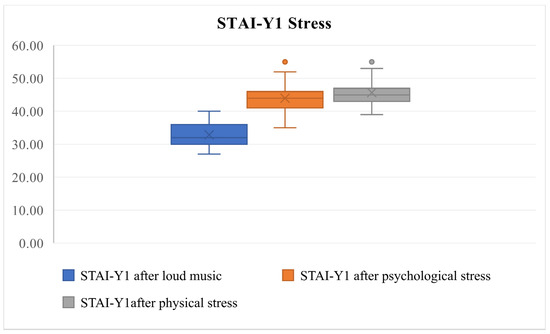 Comparison of STAI-Y1 stress values across conditions following the loud music, psychological, and physical discomfort tests using Friedman’s test (Friedman’s test, χ2 = 57.118, df = 2, p < 0.0001). Outliers (dots) indicate values significantly deviating from the interquartile range, reflecting individual variability.