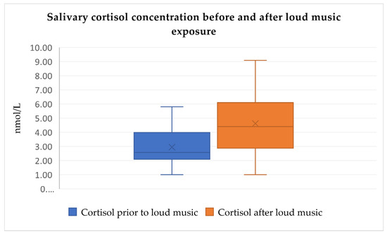 To date, there have been no reported data on direct comparisons between cortisol concentration, subjective anxiety, and stress response depending on exposure to loud music and physical and psychological stress in a single patient cohort. To address this gap, this study analyzed data supporting the hypothesis that loud music exposure, such as that from concerts, disrupts salivary cortisol regulation. Connections between exposure to loud music and changes in salivary cortisol concentration provide us with new information about the salivary stress marker link. Additionally, correlations between salivary cortisol and subjective stress levels offer insight into systemic stress response. Salivary cortisol measurements are straightforward and reliably reflect free cortisol concentration in the blood. They have been utilized in studies examining road traffic and aircraft noise exposure [17].