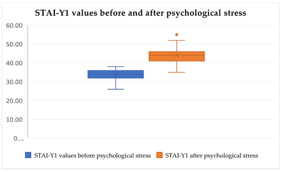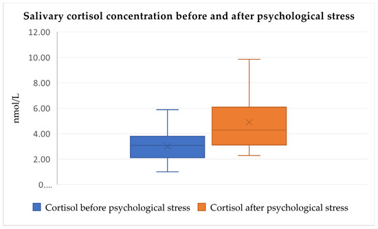 The results range between 20 and 80 points, and the subjects are then divided into three groups according to their stress and anxiety levels: 20–37 (not stressed), 38–44 (moderately stressed), and 45–80 (very stressed). A previously established cut-off value of 38 was taken as a disqualifying value, with all the participants passing through to have their salivary cortisol measured. We used part Y-1, which was translated into Croatian, and validated STAI with the purchased license [15].