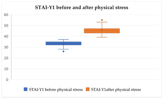 After analyzing the pre-test and post-test STAI-Y1 values, statistically significant differences in increased psychological and physical discomfort stress levels were identified after the tests (Friedman’s test, χ2 = 133.892, df = 5, p < 0.0001, Figure 5, Figure 6 and Figure 7) but were not identified in the pre-test and post-test values related to loud music exposure (Friedman’s test, χ2 = 133.892, df = 5, p > 0.05, Figure 5). In addition, the subjects subjectively rated the physical discomfort test as being equally stressful as the psychological stress test (Friedman’s test, χ2 = 133.892, df = 5, p > 0.05). Both were significantly more stressful than loud music exposure (Friedman’s test, χ2 = 133.892, df = 5, p < 0.0001).