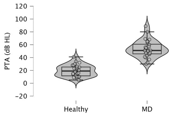 Violin plots and box plots showing pure tone averages (PTA) obtained in ears with MD and healthy ears. The pure tone average was calculated from the average of the air-conducted hearing thresholds obtained from 500, 1000, 2000, and 4000 Hz during pure tone audiometry. Healthy, healthy ears; MD, affected ears with Ménière’s disease.