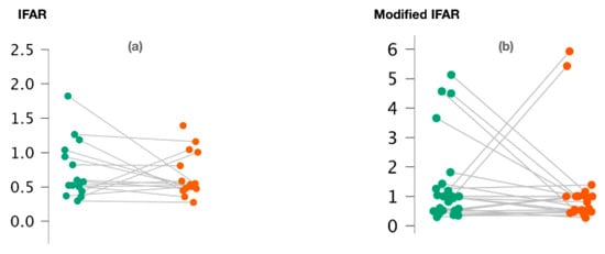 With regard to o-VEMPs, no statistically significant difference was observed between the affected ears and the healthy ears for 1000/500 Hz IFARs (p = 0.73; Wilcoxon signed-rank test) (Figure 3a). We also did not observe any difference with the 1000/500 Hz modified IFARs (p = 0.95; Wilcoxon signed rank) (Figure 3b).