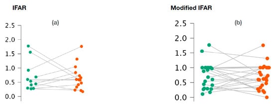 We observed no significant difference between 1000/500 Hz IFARs calculated for healthy and pathological ears when the cVEMPs were performed (p = 0.74; Wilcoxon signed-rank test) (Figure 2a). We also calculated “modified” 1000/500 Hz IFARs by replacing zero amplitude values with a 1. Similarly, with regard to c-VEMPs, no significant difference was observed between the two groups (p = 0.44; Wilcoxon signed-rand test) (Figure 2b).