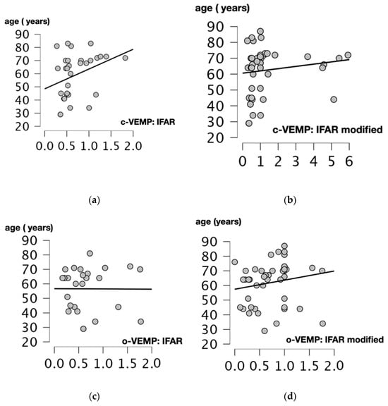 We performed Spearman’s correlation test to assess the relationship between age and 1000/500 Hz IFARs. We obtained a positive and statistically significant correlation between IFARs and participants’ age (p = 0.017, r = 0.425, Spearman’s correlation test) when the c-VEMP test was performed. For modified IFARs, a positive correlation with participant age was also observed (p = 0.012, r = 0.352, Spearman’s correlation test).
