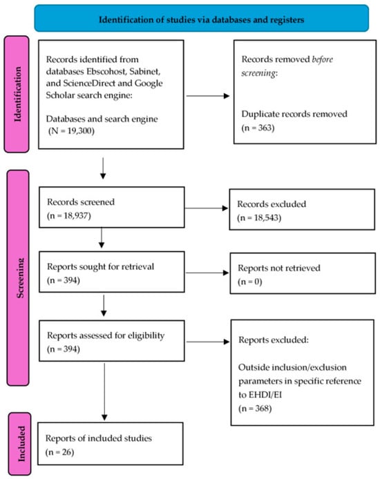 To maintain study rigour, systematic review principles regarding database and search engine searches were employed [36]. These included searching the online databases Ebscohost, Sabinet, ScienceDirect, Scopus, and the search engine Google Scholar. The specific keywords that were applied included the following: early intervention, early education, hearing impairment, deaf, hard-of-hearing, policy, guidelines, and services. Boolean operators such as “AND”, “OR”, asterisks, and parentheses were used where appropriate to refine source articles detected. To ensure current data within a more present-day focus, a timeframe relative to JCIH, FCEI-DHH, and HPCSA guidelines was chosen between January 2014 and May 2024. In addition, rigorous perusal of relevant articles’ reference lists was conducted to identify further sources. The primary researcher sourced all articles, and an iterative process was applied to refine the final selection. All articles initially selected and those included in the final dataset were reviewed by two secondary researchers to ensure the appropriateness of the final article selection.