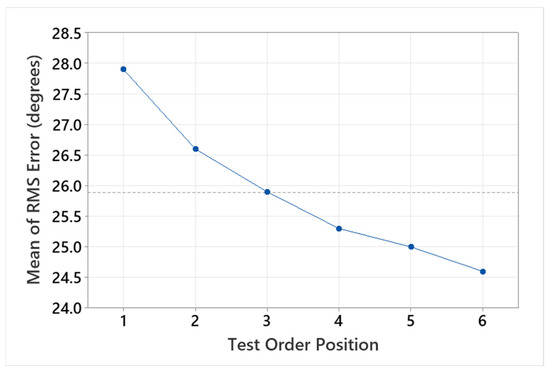 Figure 8 shows the average RMS error over positions in the test order for all participants. The results in this figure suggest that participants performed best in the second and third conditions. However, the average improvement was <3°, an insignificant difference. There were no significant learning effects throughout the test paradigm, with no marked improvement in performance in sequential test conditions when this was averaged across conditions.