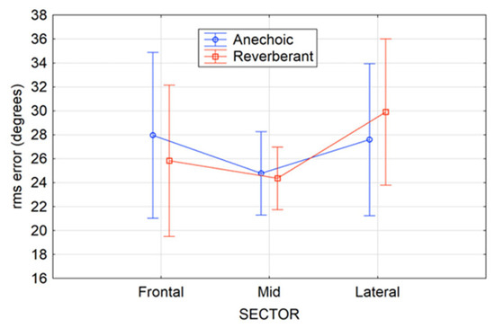 Table 1 shows results of a three-way ANOVA to examine the effects of the independent factors of the SNR, test environment, and presentation sector on RMS error. This showed no significant main effects (sector p = 0.14; environment p = 0.92; SNR p = 0.19), indicating that neither the SNR, environment, nor the sector significantly influenced localization accuracy. However, there was a statistically significant interaction between the sector and the environment F(2, 58) = 3.61, p = 0.031, indicating that the effect of the sector on RMS error depended on the simulated test environment. This is depicted in Figure 3, where participant RMS error was poorer in the anechoic condition compared to the reverberant condition when presentations originated from the frontal or mid sectors. However, within the lateral sector, average RMS error was poorer within the reverberant condition. All other two-way interactions were found to be statistically insignificant (sector × SNR p = 0.53; environment × SNR p = 0.82).