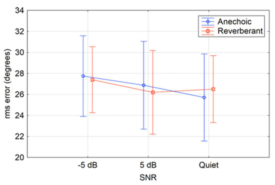 Figure 4 shows the average participant RMS error for all three SNRs (−5 dB, +5 dB, and quiet) within each of the two environments. As expected, average performance was best in the anechoic and quiet condition; however, there was a minimal and non-significant effect from the simulated environment and SNR on average RMS error overall.