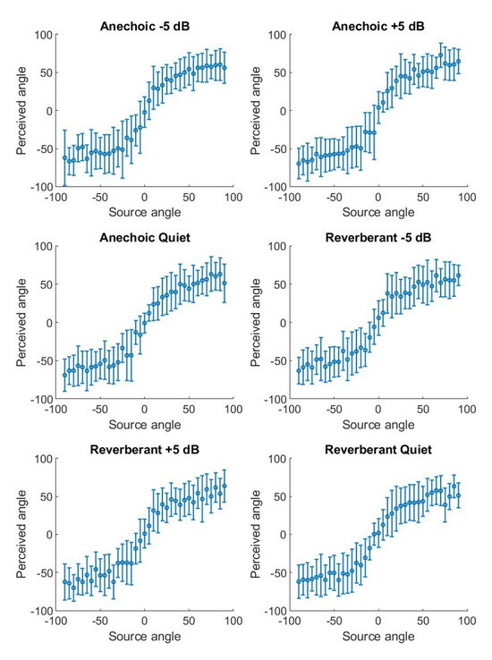 Perception function plots depicting perceived angle versus source angle. Circles show the mean, and vertical bars denote the standard deviation of perceived angles. Each graph represents responses in one of the six combinations of environment (anechoic or reverberant) and SNR (−5 dB, +5 dB, and quiet).
