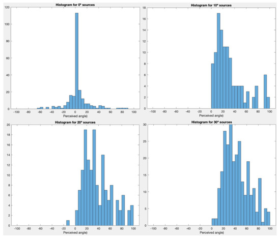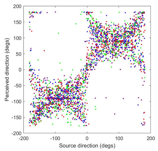 The average RMS error for Experiment 1 was relatively high compared to free-field assessments (6–10 degrees) [4] of horizontal localization with similar designs. This inflation in RMS error may have occurred for several reasons, but was hypothesized to be due to front–back errors. Front–back errors are commonly seen in stationary horizontal localization tasks due to ITDs/IIDs arriving from the frontal hemisphere being the same as ITDs/IIDs arriving from the corresponding azimuth in the reverse hemisphere [33]. Figure 6 depicts all participant responses across each condition in relation to various source angles (0°, 10° 20°, and 30°). An increase in front–back error responses can be seen as the source angle diverged from the midline. In limiting the response array to the frontal hemisphere in Experiment 1, participants who perceived these presentations as being reversed likely chose the only available reverse hemisphere option, namely ±95 or 100 degrees, resulting in the inflation of the RMS error. This result prompted Experiment 2, which proposed that allowing participants access to a 360-degree response array would allow for greater correlation with the appropriate azimuth, albeit within the reverse hemisphere.