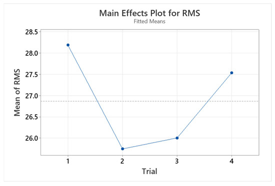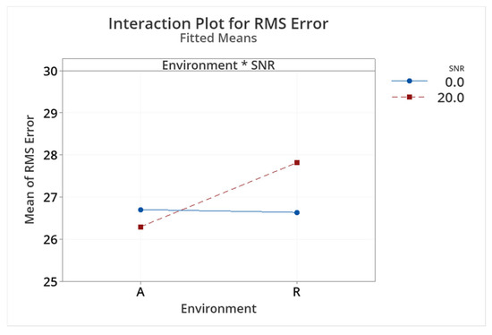 Prior to data analysis, RMS error scores for each condition were run through a front/back correction paradigm, a common practice in virtual localization tasks [33]. All source directions and perceived directions were reflected to the frontal hemisphere before calculating the discrepancy between the two directions. Minitab statistical software (version 19.2) [34] was used to determine the effects of the SNR and Simulated Test Environment (see Condition/Environment Simulation above) on the ability of participants to localize on the lateral plane, with measurements of RMS error being the dependent variable. A Two-way Repeated Measures Analysis of Variance (ANOVA) was conducted with the SNR and Test Environment as fixed factors and Subject as a random factor. Learning effects were investigated by plotting the mean performance of participants based on test order position regardless of the condition being examined.