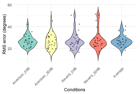 Figure 10 shows the average RMS error for all participants under both SNRs (0 dB and +20 dB) in both test environments (anechoic and reverberant). At an SNR of 0 dB, the test environment had a minimal effect on participants’ abilities to perform the task well. Although Figure 10 suggests that, at an SNR of +20 dB, participants appeared to perform better under anechoic conditions, the difference was only 1.5° and was not significant. Table 3 shows the results of a two-way repeated measures ANOVA investigating the effects of the SNR and test environment. Variations in the SNR and test environment did not influence participants’ abilities to localize in the horizontal plane under the headphone-based task (SNR p = 0.73; test environment p = 0.51). Additionally, there was no significant interaction between the SNR and the test environment (p = 0.47).