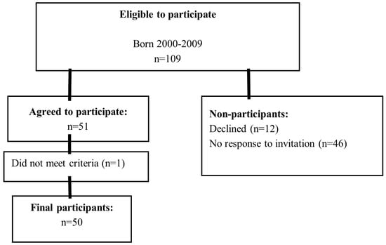 A total of 135 individuals met the criteria of age at implantation <30 months and were aged 12–22 years in the clinical database. Twenty-six individuals were excluded due to non-fulfillment of inclusion criteria (other curriculum). Invitations were sent to 109 individuals who were followed-up at Karolinska University Hospital and met the study criteria. Twelve declined to participate, 51 accepted the invitation and the remaining 46 did not respond. One participant was incorrectly invited from start (did not meet the inclusion criteria of age at CI 1) and was therefore excluded from the study (Figure 1). The final number of participants was 50 (27 females and 23 males), aged 12–22 years (see Table 1 in the results section). The majority used spoken Swedish as their primary communication mode (n = 42), three participants used at least two spoken languages in their daily communication. Another four participants used spoken Swedish with sign support (n = 4) and one participant primarily used sign language and some spoken Swedish (n = 1). For further demographic background information and hearing characteristics see Table 1 and Table 2.
