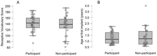 To assess whether the participants were representative of the broader population, we analyzed previously collected clinical data on receptive vocabulary for those who agreed to participate (n = 50) and those who declined or did not respond to the invitation (n = 58). Data for the Peabody Picture Vocabulary Test, PPVT (3 and 4) [89,90], were available for 42 of 50 (84%) of the participants at a mean age of 10.0 years (SD = 1.0 years) and 36 of the 58 (62%) non-participants at a mean age of 10.1 years (SD = 0.9 years). The analysis revealed no differences in receptive vocabulary outcomes (p = 0.30, independent samples t-test) (Figure 2A), or age at implantation (p = 0.65, independent samples t-test) (Figure 2B) between participants and non-participants.