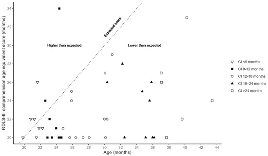 Language understanding after one year with 1st CI. RDLS-III age equivalent comprehension scores (mean = 22.9 months, range = 20–34 months*) at one year post 1st CI (n = 43, mean age = 28.9 months, range = 19.9–43.4 months, mean age at 1st CI = 15.8 months, range = 7.3–29.3 months). Five groups were created based on age at 1st CI; CI <9 months (n = 7, mean age = 21.3 months, mean age at 1st CI = 8.3 months), CI 9–12 months (n = 9, mean age = 23.8 months, mean age at 1st CI = 10.7 months), CI 12–18 months (n = 12, mean age = 27.9 months, mean age at 1st CI = 14.9 months), CI 18–24 months (n = 9, mean age = 34.3 months, mean age at 1st CI = 21 months), and CI > 24 months (n = 6, mean age =39.2 months, mean age at 1st CI = 26 months). Dotted line illustrates expected score for age, scores above the line are higher than expected and scores below the line are lower than expected. Note: RDLS-III = Reynell Developmental Language Scales III, * < 21 months is the lowest possible score of RDLS-III, 20 months was used for this score.