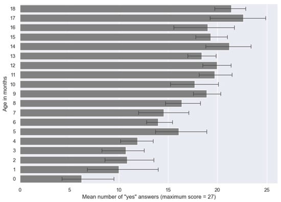 Older children were more likely to answer ‘yes’ than younger ones, as illustrated in Figure 1. The strong and statistically significant correlation between age and overall scores (r = 0.67; p < 0.001) underscores the tight linkage between the development of children’s speech production capabilities and their age.
