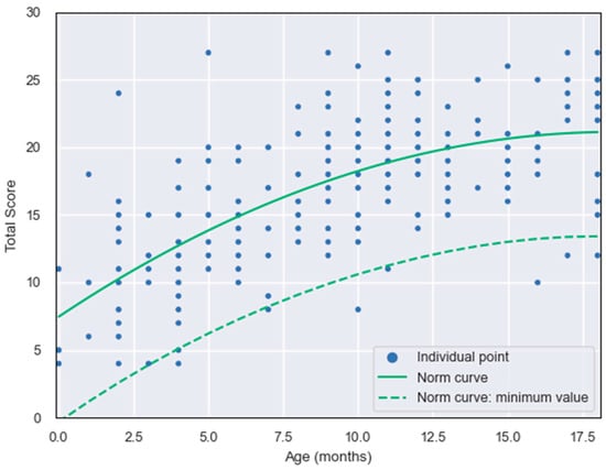 A regression analysis was conducted to create a normative curve for early speech production in children aged 0 to 2 years. In this analysis, “age” served as the independent variable and “total score” as the dependent variable. The least squares method was used for calculations. The chosen model is a second-order polynomial regression, represented by this Equation:
