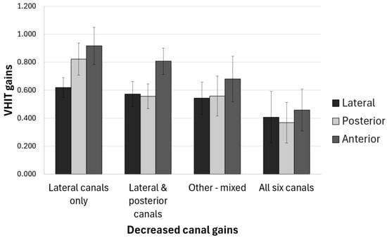 p = 0.0710 for the anterior canal gains). An important point to note is that, due to the strict criteria, only one patient was included in Group 1; therefore, the statistics should be interpreted with caution. No patient in this cohort met the presbivestibulopathy criteria. A comparison of all subgroups across the different canals is presented in