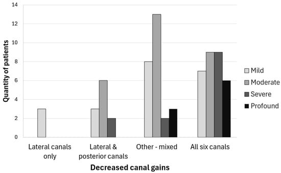 Figure 2). As we can see, only mild cases of hearing loss were found when lateral canal gains only were decreased (Group 1), and the greatest quantity of patients with profound hearing loss was found in Group 4, where canal gains were decreased for all canals. Although a trend indicating increased hearing loss severity with the number of affected canals in VB was observed, no significant association was found between the subgroup and the severity of hearing loss. Also, three patients experienced unilateral sudden sensorineural hearing loss.