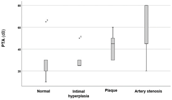 PTA values based on changes observed through carotid–vertebral Doppler ultrasonography. In the boxplots, the boxes represent the interquartile range of the data, while the whiskers indicate the lower and upper quartiles. The black line that divides the boxes marks the median values. Statistical differences were analysed using the Mann–Whitney U test and Kruskal–Wallis test (p < 0.05 *). dB = decibel; PTA = pure-tone average. The asterisks and numbers displayed in the figure denote the outliers.