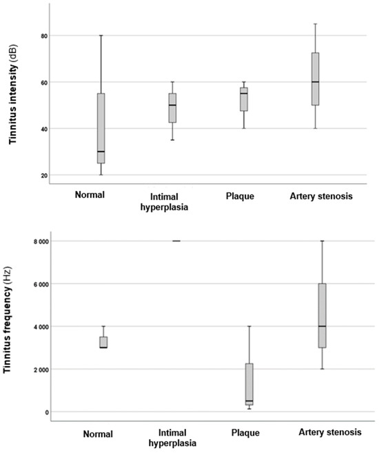Figure 2 illustrates a tendency for correlations between carotid–vertebral Doppler ultrasonography results and both the intensities and frequencies of tinnitus. When comparing tinnitus intensity across the four groups, a statistically significant difference was found (p = 0.013 *; H = 15.71). Further analysis revealed that the group with intimal hyperplasia had significantly higher tinnitus intensity values (p = 0.006 *, z-score: 2.73; Cohen’s d = 0.6). Similarly, the carotid artery plaques group (p = 0.041, z-score: 2.03; Cohen’s d = 0.58) and the carotid artery stenosis group (p = 0.005 *, z-score: −2.75; Cohen’s d = 0.7) also exhibited higher tinnitus intensities compared to the normal results group. Therefore, a more severe change in the carotid arteries may indicate louder tinnitus. Although a similar trend was observed regarding tinnitus frequencies, the differences were not statistically significant (p = 0.401; H = 2.93). This suggests that more severe changes in the carotid arteries may be associated with louder tinnitus.