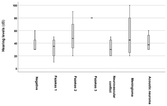 PTA based on alterations detected on brain MRI. The black line that separates the boxes marks the median values. The statistical differences were analysed using the Mann–Whitney U test and Kruskal–Wallis test (p < 0.05). dB = decibel; PTA = pure-tone average.