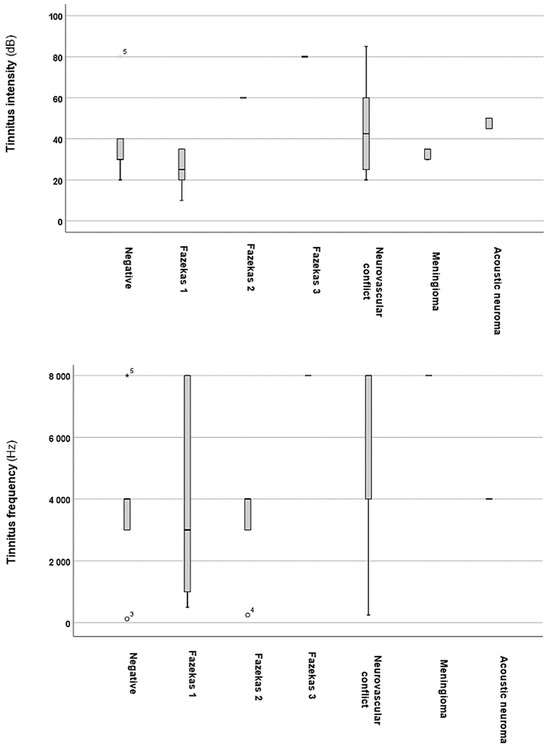 Tinnitus intensities and frequencies based on alterations detected on brain MRI. The black line that separates the boxes marks the median values. The statistical differences were analysed using the Mann–Whitney U test and Kruskal–Wallis test (p < 0.05 *). dB = decibel; Hz = Hertz. The asterisks/circles and numbers in the figure represent the outliers.