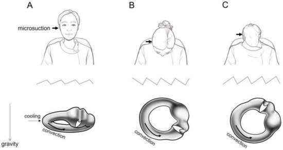 In our study, microsuction-induced nystagmus was observed in 95% (81 out of 85) of patients with various TM appearances. When comparing only patients with a history of open cavity mastoidectomy, the proportion of patients with microsuction-induced nystagmus was higher in our study (100%) compared to the previous study (80%) [7]. This difference may be explained by the use of video Frenzel glasses in our study, as opposed to naked-eye observation in the previous study. Nystagmus can be suppressed by visual fixation, which would occur in naked-eye assessments. It is noteworthy that the proportion of patients with microsuction-induced nystagmus was not significantly different between the no TM perforation group (92%, 46 out of 50) and the groups including TM perforation, open cavity mastoidectomy, and adhesive otitis media (100%, 35 out of 35) in our study. Another interesting finding was that the direction of microsuction-induced nystagmus reversed between the bowing and leaning positions. Considering the anatomy of the lateral semicircular canal in these positions (Figure 1B,C), this supports the hypothesis that microsuction-induced nystagmus is caused by convection of the lateral semicircular canal endolymph due to the cooling effect. We believe that the cooling effect might not be strong enough to induce nystagmus in some patients with otitis media with effusion (Table 1).