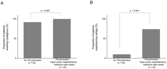 The proportion of patients showing microsuction-induced nystagmus or vertigo according to the appearance of the tympanic membrane (TM). (A) The proportion of patients with microsuction-induced nystagmus was higher in patients with normal TM, normal postoperative TM after canal wall-up mastoidectomy, and otitis media with effusion than those with TM perforation, open cavity mastoidectomy, and adhesive otitis media, which was not statistically significant (p = 0.087). (B) The proportion of patients with microsuction-induced nystagmus was higher in patients with normal TM, normal postoperative TM after canal wall-up mastoidectomy, and otitis media with effusion than those with TM perforation, open cavity mastoidectomy, and adhesive otitis media, which was not statistically significant (p = 0.087).