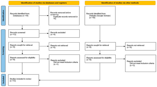 The identification and selection of the studies included in this systematic review were represented by the PRISMA flow diagram (Figure 1). The initial search strategy identified 37 publications from databases and other sources. Ten duplicates were removed, leaving 27 publications for title and abstract review. The number of publications for each source after duplicate removal is shown in Table 1. Ten publications were excluded due to irrelevance based on the title and abstract review. A full study review was undertaken on the remaining 17 publications to determine eligibility based on inclusion and exclusion criteria. This process identified 13 studies meeting the study criteria. These publications were subjected to data extraction and analysis of results.