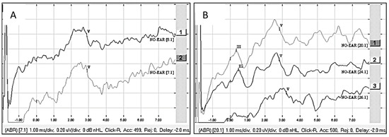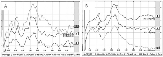 (A) eABR from ANTS, stimulation on electrode contacts 3 and 4 at 45 qu [1] and 42 qu [2]. (B) eABR from CI, stimulation at 39 qu on electrode contacts 1 [1], 7 [2], and 11 [3]. Observe that there is a 2.5 ms delay on the stimulus window when studying the waveform latencies.