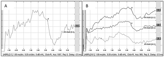 The patient was presumably deaf in the left ear from the age of 6, but it was possible that they had been deaf from an earlier age. The deafness duration was at least 50 years in the ear to be implanted. There was hearing loss for 16 years in the right ear, and a hearing aid was used in that right ear. The ANTS was stimulated on electrode contacts 3 to 4 with a pulse width of 60 μs at 750 cu (45 qu), and a clear wave V was detected (Figure 4A). Additional stimulations on electrode contacts 2 to 4 at 750 cu (45 qu) gave a clear wave V with raised amplitude when stimulated at 850 cu (51 qu). The patient was implanted with a Synchrony Flex Soft electrode, and an eABR was measured when stimulating electrodes 1, 7, and 11 at a pulse width 30 μs and an amplitude of 1000 cu (30 qu). No clear wave V could be found from that stimulation. Raising the stimulation to pulse width 60 μs and an amplitude of 650 cu (39 qu) gave a clear wave V when stimulating electrodes 1 and 7 (Figure 4B). At first fitting, the patient obtained hearing sensations from CI stimulation as well as some facial nerve stimulation. The sound was perceived as noise, and the patient perceived all sounds coming from the right ear (the not implanted ear). After one week, the CI was still noisy and unclear, and the patient got tinnitus from using the CI. They could hear some environmental sounds. There was no speech perception with the CI after one month, and the CI disturbed the hearing aid, making the bilateral hearing worse when using the CI. The patient used the CI full-time but took it off to hear better in some situations. There was still no speech perception with the CI after one year, and audiological testing made it clear that the CI made the bilateral hearing worse. After two years, the patient scored 65% on the three-digit test, and the CI no longer disturbed the bilateral hearing. At that point, the patient used the implant 2 h per day. After five years, the patient scored 80% on the three-digit test and 12% on the BS-word test. The bilateral MS-word test showed better results using the CI and the hearing aid together compared with using the hearing aid only. The speech perception with the CI has not improved since the 5-year appointment, and the patient uses the CI approximately 1 h per day. Today, the patient is also implanted in the right ear and uses that CI full-time and the left implant a few hours a day.