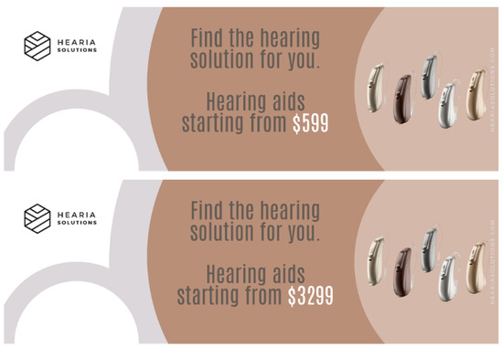 Users who accessed the study first read an information letter about the tasks involved in the study and then completed an informed consent questionnaire, followed by a demographic information questionnaire. To simulate the experience of looking up information about hearing loss online, participants were instructed to read a page of text about hearing loss and its health impacts, after which they were asked to answer questions about the text at the bottom of the page. While reading, participants were exposed to our price anchoring manipulation, in which they were randomized to see banner advertisements for HAs that displayed either a high or low price point. The banners for the conditions were identical except for the price they quoted: they featured a logo for a fictitious hearing aid company named Hearia Solutions on the left and a collage of behind-the-ear HAs on the right. In the center, the banners read “Find the hearing solution for you”. In the low anchor condition, the banner additionally read “Hearing aids starting from USD 599”, while in the high anchor condition it read “Hearing aids starting from USD 3299”. The price’s text color was white to create contrast between it and the surrounding text. In each condition, the same banner was placed both at the top and bottom of the hearing loss information page to increase the likelihood that participants would notice it. The size and placement of the banner were designed to mimic common ways in which sponsored content banner advertisements are positioned on popular websites. See