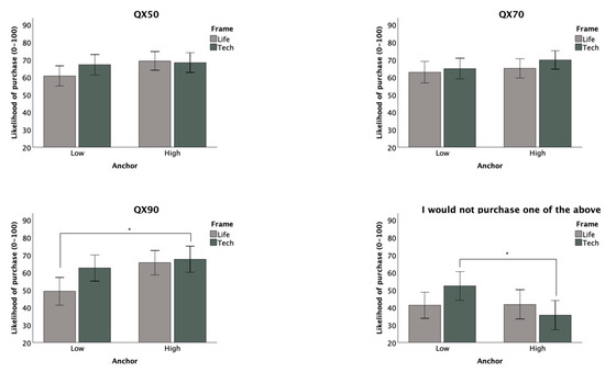 32], we ran exploratory analyses of covariance for each of our four outcomes with both the above and below knowledge median subsets. Neither anchoring nor framing manipulations were significant in the models with our higher HA knowledge subset. However, for the low HA knowledge subset, anchoring was significant for the QX90 (